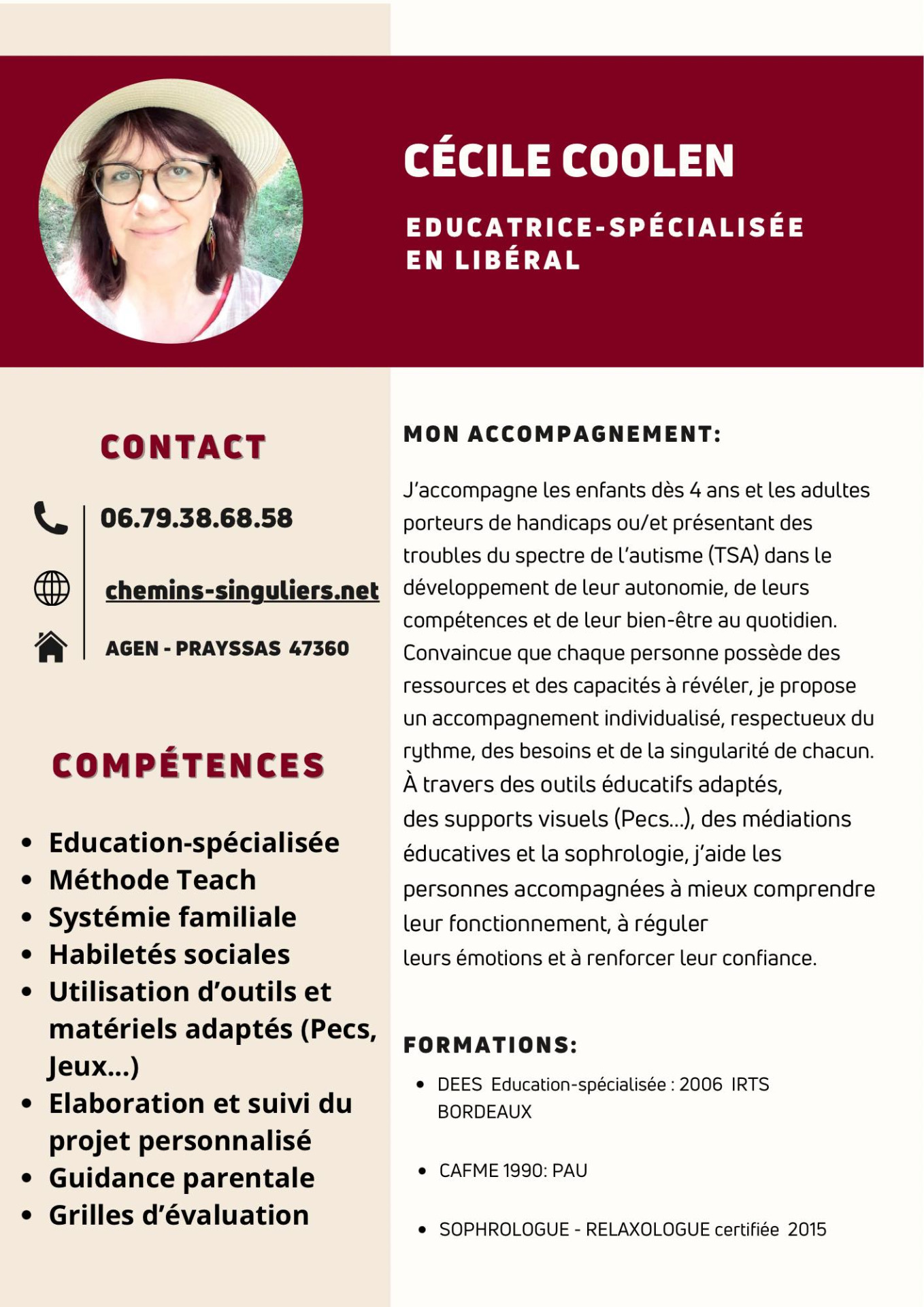 Éducatrice-spécialisée depuis 2006, j'accompagne à présent les enfants dès 5 ans et les adultes porteurs de handicaps, dont les Troubles du Spectre de l'Autisme (TSA).